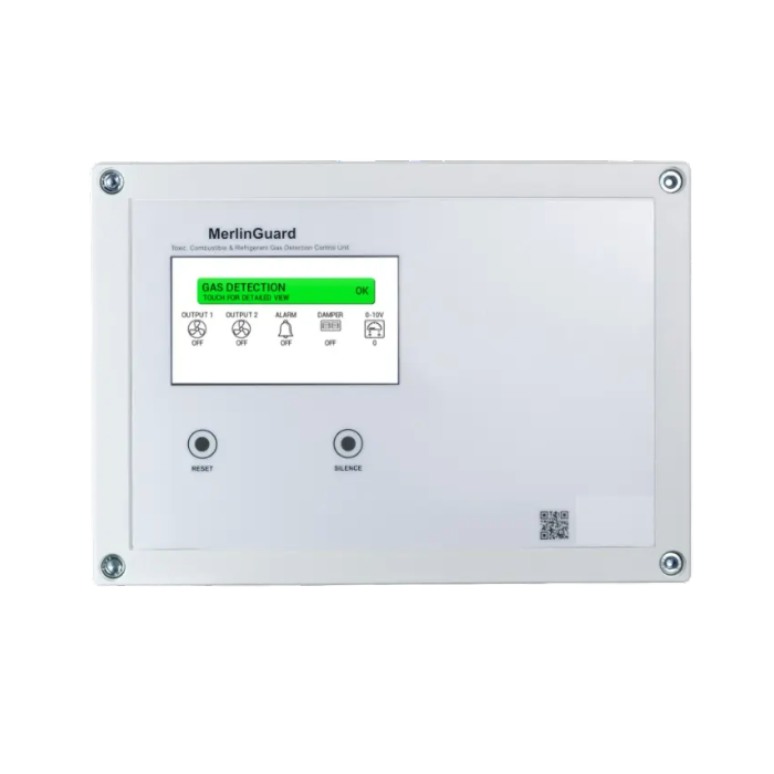 The MerlinGuard is a gas detection and ventilation panel compatible with up to sixteen (16) refrigerant x detectors. It offers a pre-programmed control panel with features such as fan control, alarm damper control, and seamless integration with Building Management Systems (BMS). The system can also be used to monitor other x range detectors by S&S Northern.